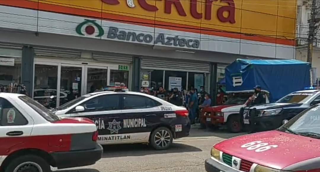 Minatitlán, Ver.- Una mujer de mediana edad que había acudido a retirar un dinero a Banco Azteca al interior de la tienda Elektra del Grupo Salinas de magnate Ricardo Salinas Pliego, fue asaltada por delincuentes que le quitaron la cantidad de 45 mil pesos y le dispararon con un arma de fuego causándole solo un razón de bala.