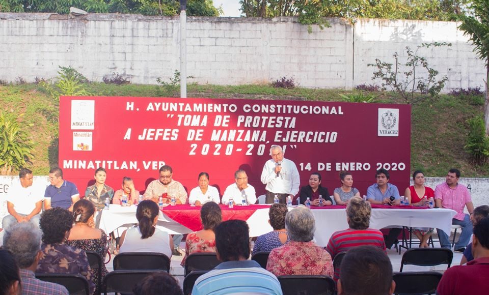 MINATITLÁN, VER.- Para facilitar las tareas de apoyo a la ciudadanía el Presidente Municipal, Don Nicolás Reyes Álvarez, tomó protesta a mil 412 personas que durante el periodo 2020-2021 mantendrán colaboración con el Ayuntamiento como Jefes de Manzana de las diferentes colonias que integran la cabecera municipal de Minatitlán.