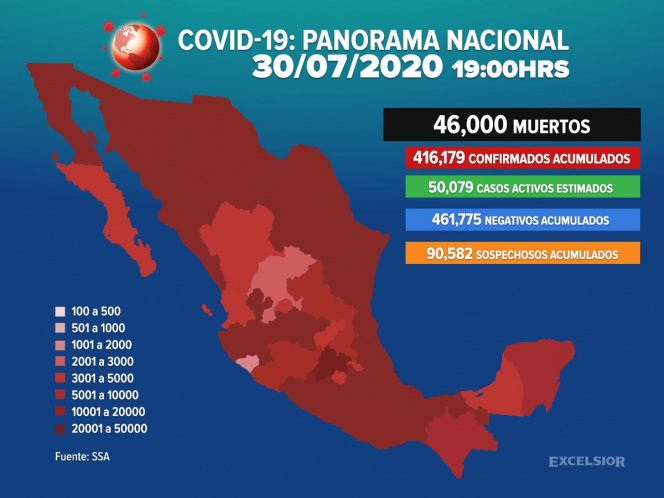 Autoridades de la Secretaría de Salud informaron este día que el número de muertos por coronavirus en México llegó a 46 mil, mientras que los casos confirmados alcanzan los 416 mil 179.